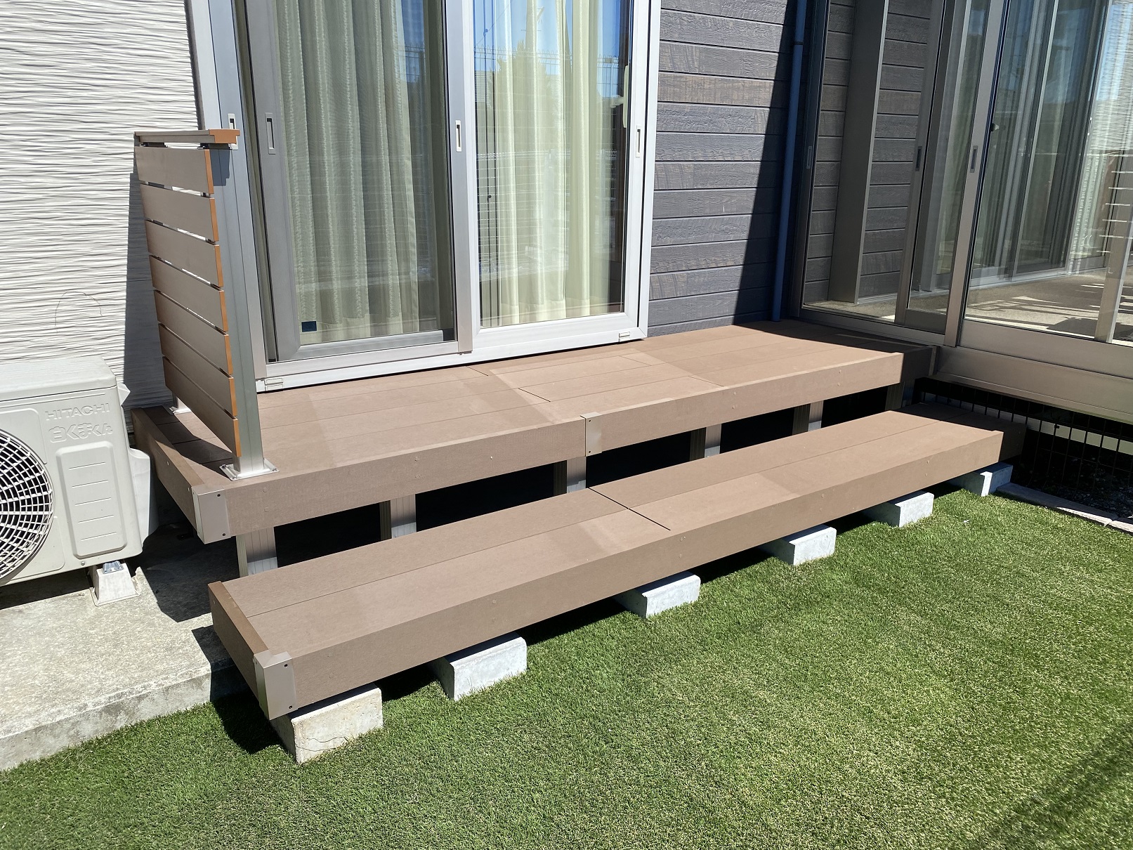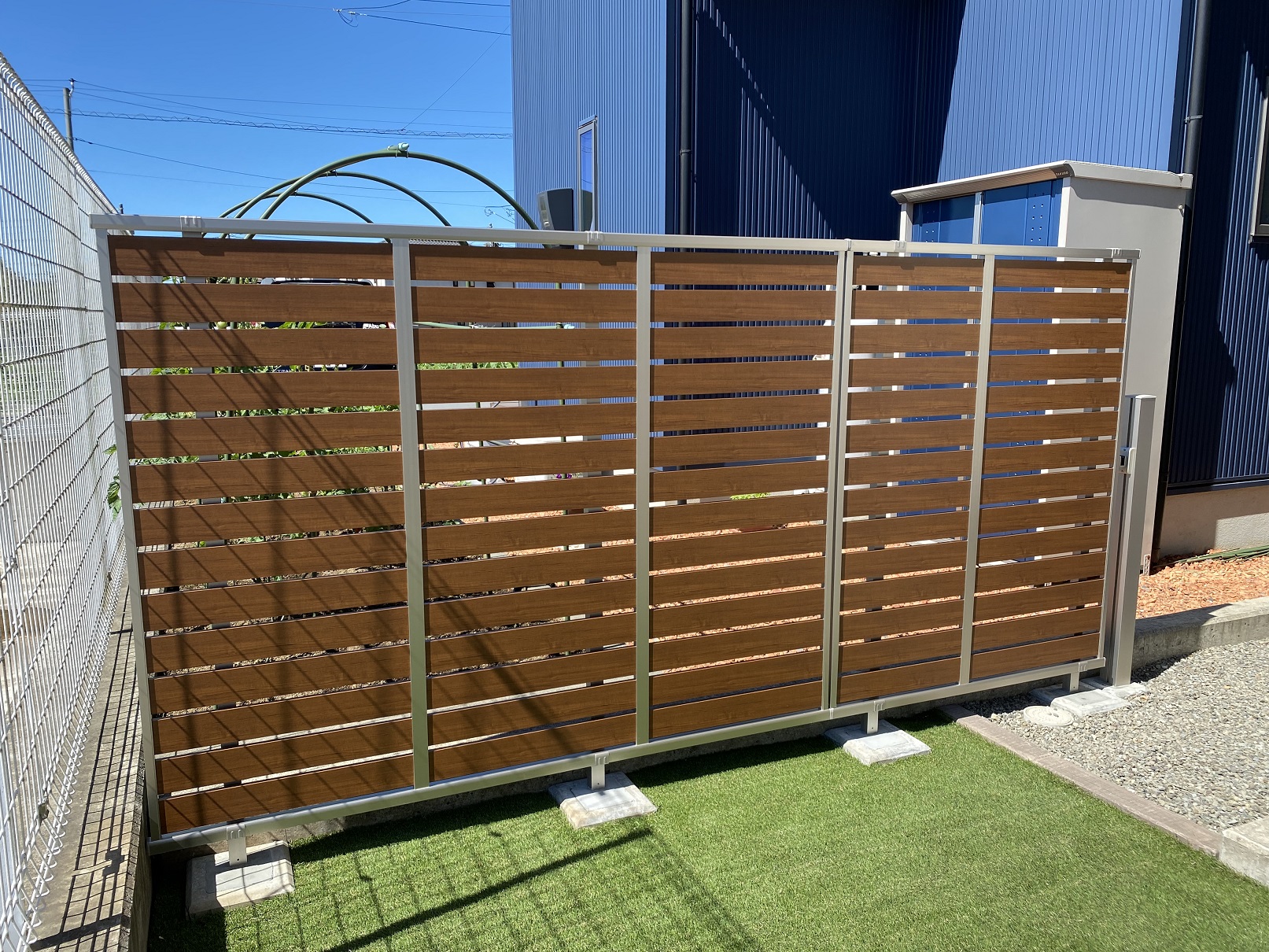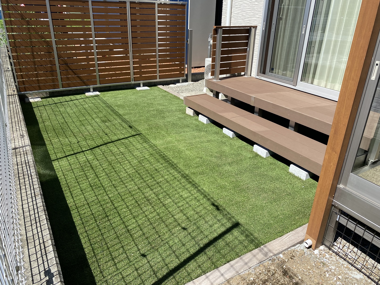 人工木ウッドデッキ・人工芝・目隠しフェンス・門扉・土間コンクリートの施工を行いました。 目隠しフェンスは、「YKK ルシアス スクリーンフェンス DO2型」を使用しました。 このフェンスは、外からの視線をカットし、屋内空間を快適にする高尺目隠しフェンスです。 片面木調デザインにより、意匠とリーズナブルな価格の両立を実現した商品です。 ウッドデッキと人工芝があると、お子さんの遊び場、家族団欒の場としても利用できます