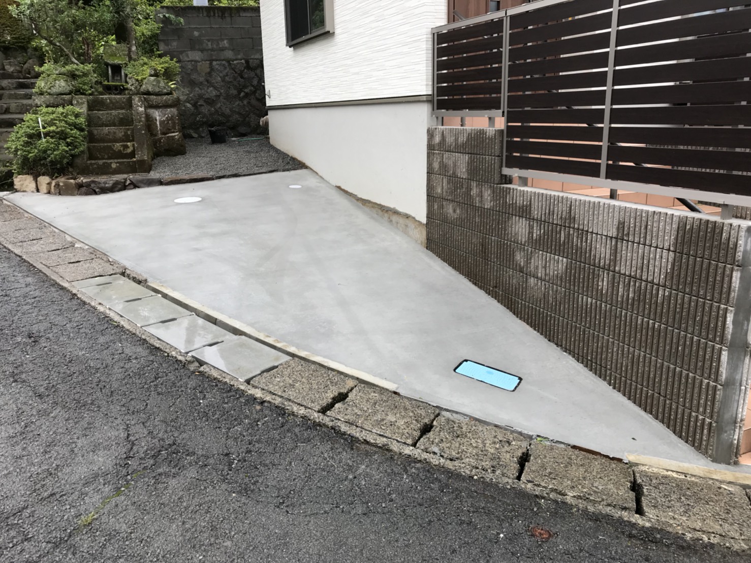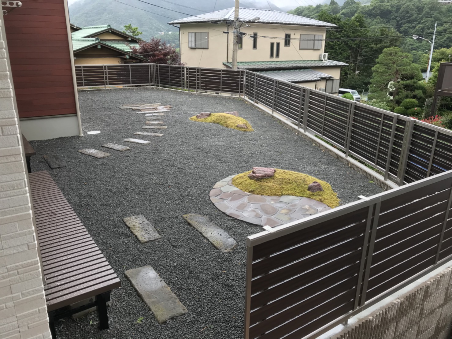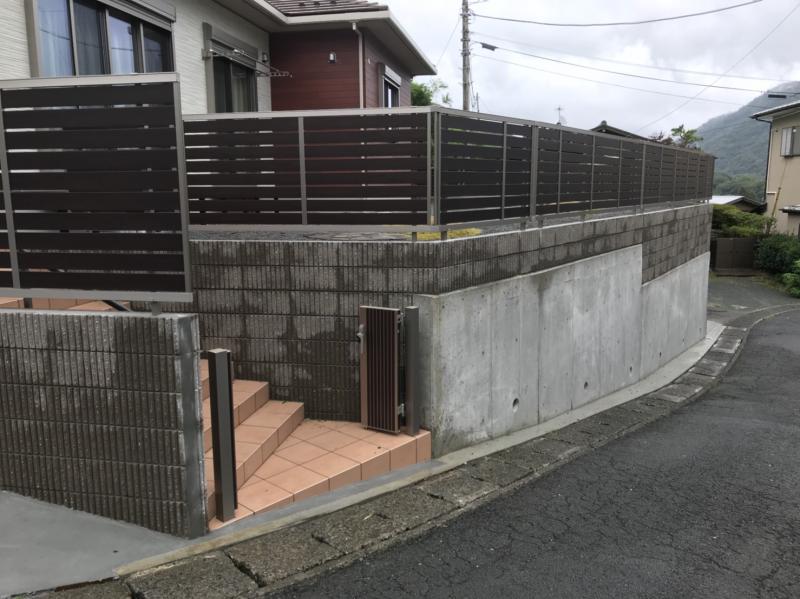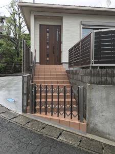 建物と道路の高低差があるお家で、落下の危険を防ぐためブロックを積み目隠しフェンスで高さを設けました。 フェンスのデザインとカラーは建物に合う明るすぎない物を選ばしていただきました。 和風をベースにし、コケや石張りなどそれぞれを強く協調しすぎないデザインとなりました。 つい座りたくなる濡れ縁を置き和風を崩さず落ち着きのある仕上がりとなりました。 入口には伸縮門扉を設けセキュリティー面に気を付け、階段のタイルには明るめの色を用い歩き易さをメインとさせていただきました。