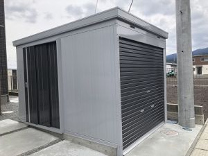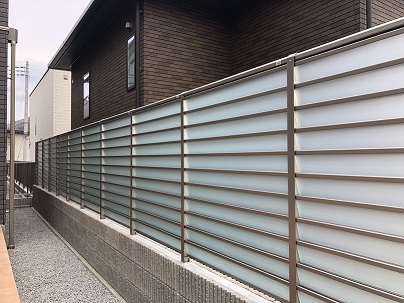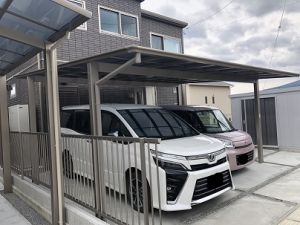 建物に合わせ目立ち過ぎないシンプルなデザインとカラーを選択しました。 高低差のある裏側にブロックを設け目隠しフェンスに、サニブリーズフェンスを施工しました。パネル部分をアルミのルーバータイプではなく、採光タイプにすることで日の入り方を明るくすることで、影により暗くなってしまうお庭を照らしてくれるようにしました。 バイク倉庫は作業もできる大きさにし、2台用カーポートには丸みを出さずに Fタイプにしアプローチにかかり過ぎず歩けるスペースを確保しました。