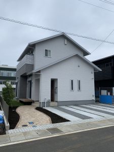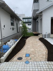 白を基調にした新築の建物で駐車スペースの土間に 変化を付けたいとの事で幅広めの砂利スペースを アクセントにしました。 玄関にむかってユニソンのティーナでS字のアプローチを 配置し、奥には天然芝、人工木デッキ樹ら楽ステージ木彫 を設置、シンボルツリーには常緑のヤマボウシ、シラカシ を2本植え緑が映えるコントラストに仕上げました。 新築のお宅と相まって明るいオープン外構になりました。