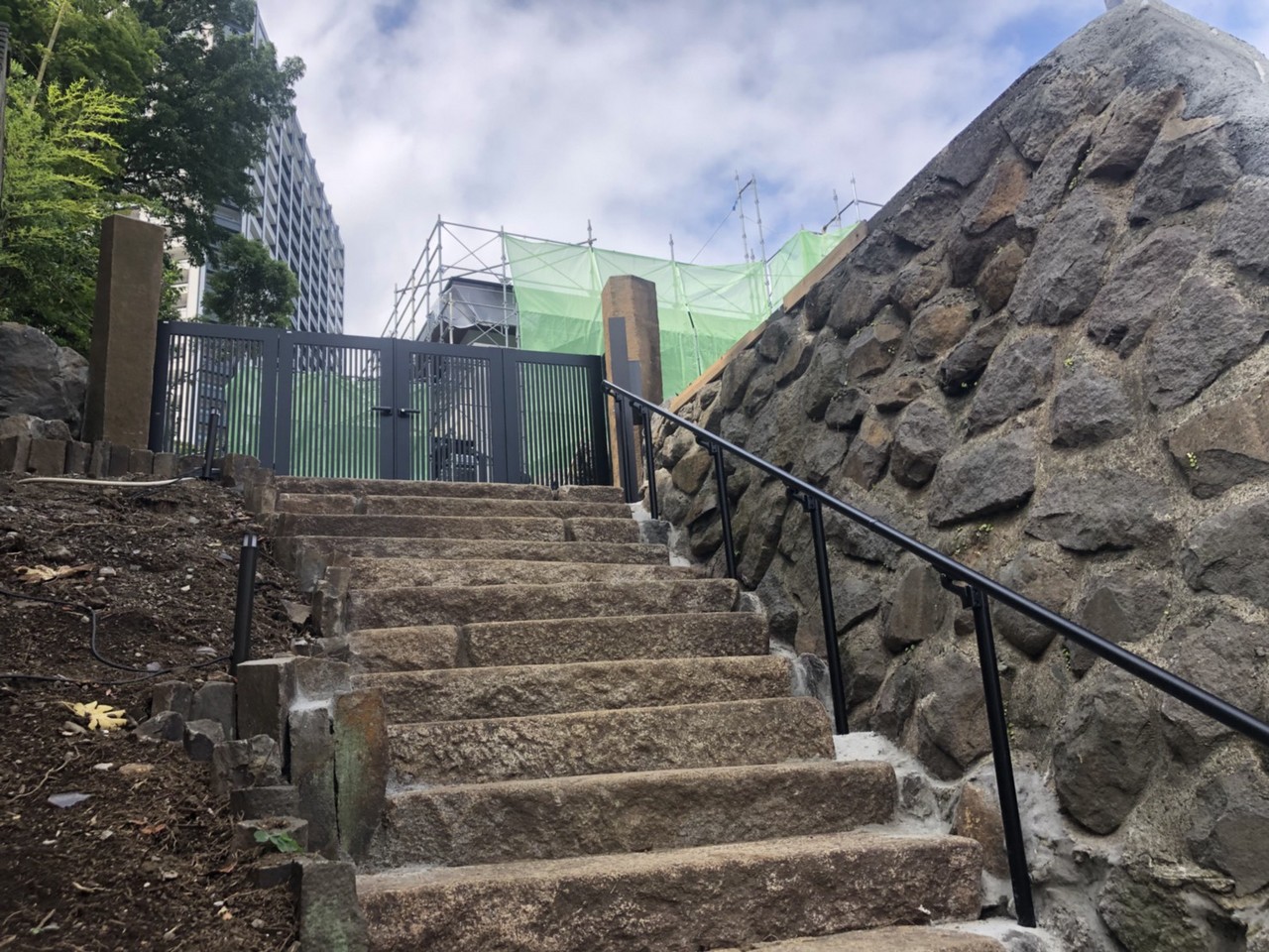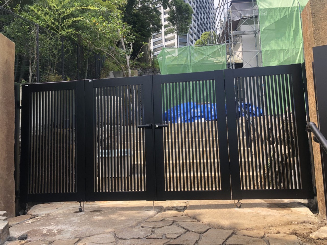 開口部が六方石の門柱で決まっていて、 通常の規格サイズのアルミ門扉だと寸法が足りない為 4枚折戸の両開き門扉を設置しました。 三協アルミ 和峰1型 H1400 ブラック色です。 石積みの階段脇にアルミの手すりも色目を合わせて 設置しました。 このお宅はまだまだフェンス・カーポートなどを 設置する予定なので、楽しみな物件です。